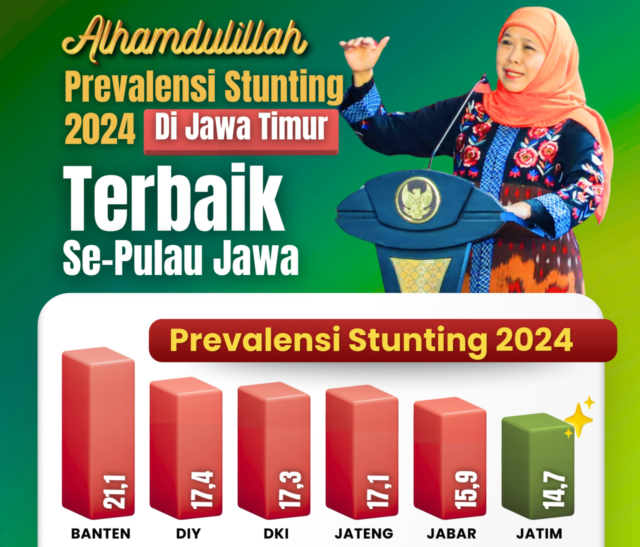 Berdasarkan Survei Status Gizi Indonesia (SSGI) 2024 yang dirilis oleh Badan Kebijakan Pembangunan Kesehatan (BKPK) Kemkes RI tanggal 26 Mei 2025, prevalensi stunting Jatim turun signifikan menjadi 14,7 persen, dan merupakan yang terbaik kedua nasional setelah Bali.