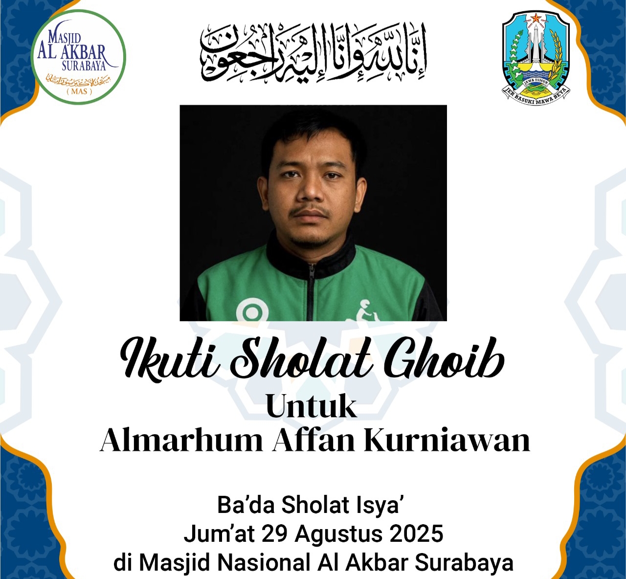 SURABAYA – Pemerintah Provinsi Jawa Timur mengajak masyarakat luas untuk bersama-sama menunaikan salat ghaib bagi almarhum Affan Kurniawan, pengemudi ojek daring yang wafat dalam insiden di Jakarta Pusat pada 28 Agustus 2025.