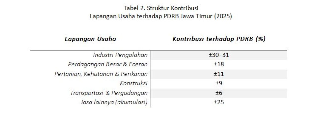 Struktur ini menjelaskan dua hal. Pertama, daya tahan ekonomi Jawa Timur cukup kuat karena ditopang sektor industri dan perdagangan. Kedua, ketergantungan pada sektor tradisional menunjukkan bahwa agenda transformasi ekonomi—menuju industri bernilai tambah tinggi dan jasa modern—masih perlu didorong secara lebih agresif.