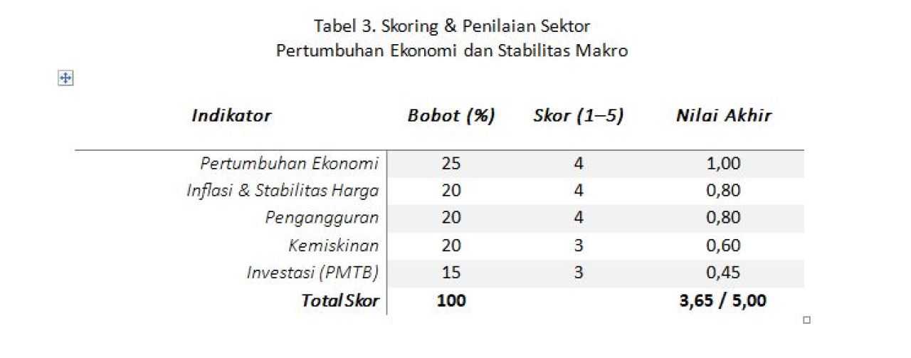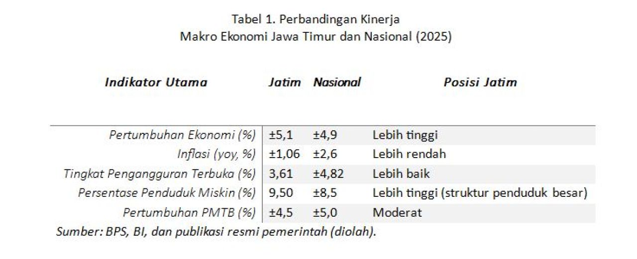 Tabel tersebut menunjukkan bahwa kinerja makro Jawa Timur relatif kuat, khususnya pada pertumbuhan ekonomi, inflasi, dan pengangguran. Inflasi yang rendah memberi ruang stabilitas daya beli, sementara tingkat pengangguran yang lebih rendah dari nasional menunjukkan kemampuan ekonomi daerah dalam menyerap tenaga kerja.