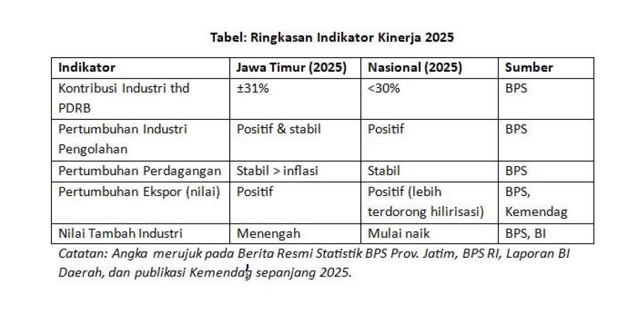 Pertumbuhan industri memberi tenaga, tetapi nilai tambah memberi arah. Pada tahun 2025 Jawa Timur terbukti telah “bekerja keras”, maka pekerjaan berikutnya yang diharapkan adalah “bekerja lebih cerdas” agar kekuatan industrinya benar-benar mengangkat daya saing daerah dan kesejahteraan pekerja. (Seri berikutnya akan mengulas sektor ketiga dalam kerangka kajian yang sama).