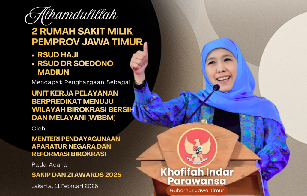JAKARTA - Dua Rumah Sakit Umum Daerah (RSUD) milik Pemerintah Provinsi Jawa Timur, yakni RSUD Haji Provinsi Jawa Timur dan RSUD Dr. Soedono Madiun, resmi meraih predikat Zona Integritas Menuju Wilayah Birokrasi Bersih dan Melayani (WBBM) dalam ajang SAKIP dan Zona Integritas (ZI) Award 2025.