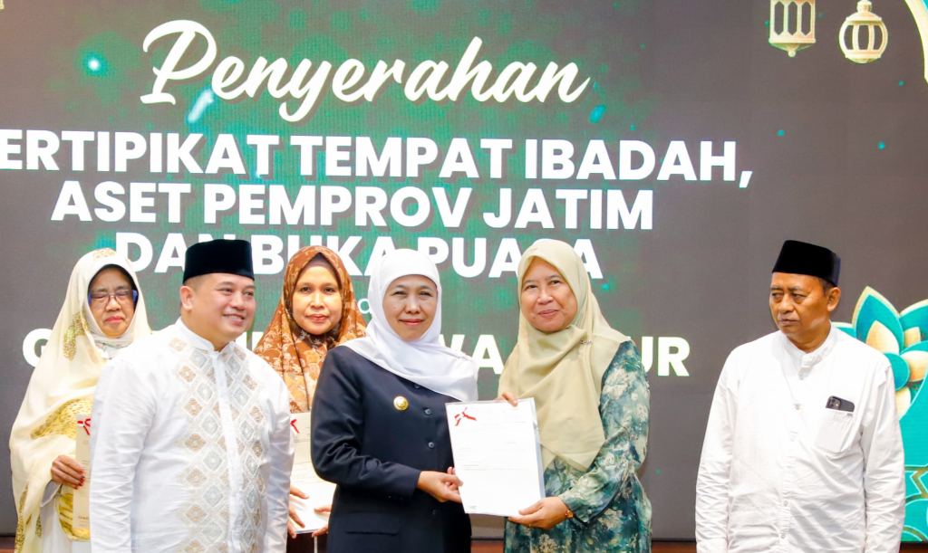 SURABAYA – Gubernur Jawa Timur Khofifah Indar Parawansa bersama Kepala Kantor Wilayah Badan Pertanahan Nasional (BPN) Provinsi Jawa Timur, Asep Heri menyerahkan sebanyak 444 sertipikat hak pakai atas nama Pemerintah Provinsi Jawa Timur dan tempat ibadah yang dilakukan di Gedung Negara Grahadi, Surabaya, Selasa (3/3/2026).