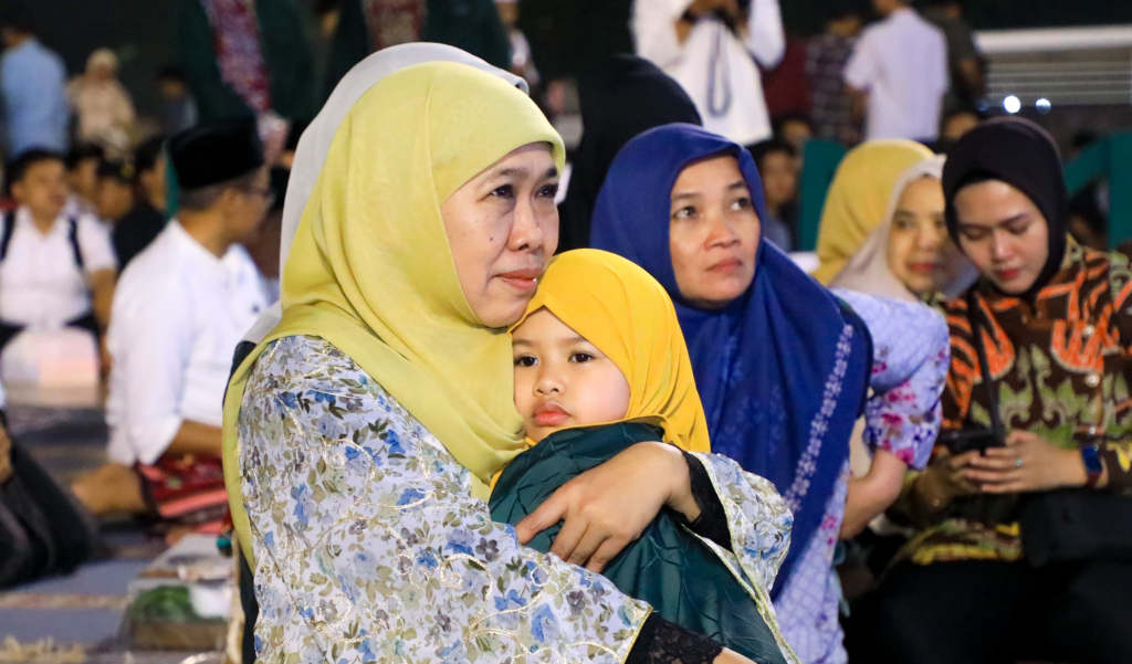 Usai pelaksanaan Qiyamul Lail, Gubernur Khofifah bersama cucunya Aila serta Wagub Emil melanjutkan kegiatan dengan sahur bersama jemaah di selasar Masjid Nasional Al Akbar Surabaya.