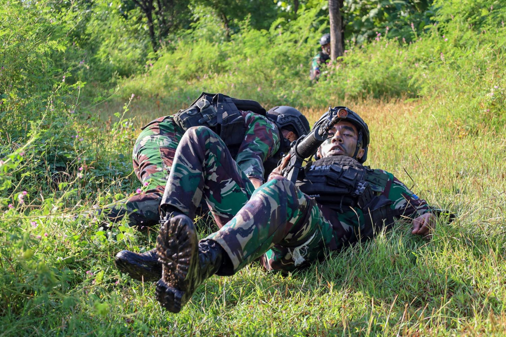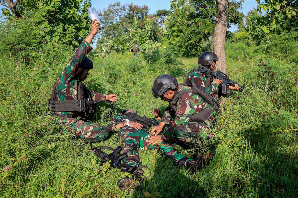 Tekanan latihan meningkat saat simulasi gangguan dari penembak runduk memicu situasi darurat. Seorang prajurit dilaporkan mengalami luka tembak dalam skenario tersebut. Respons cepat langsung dilakukan melalui penerapan Pertolongan Taktis Korban Tempur (PTKT) atau Tactical Combat Casualty Care (TCCC).