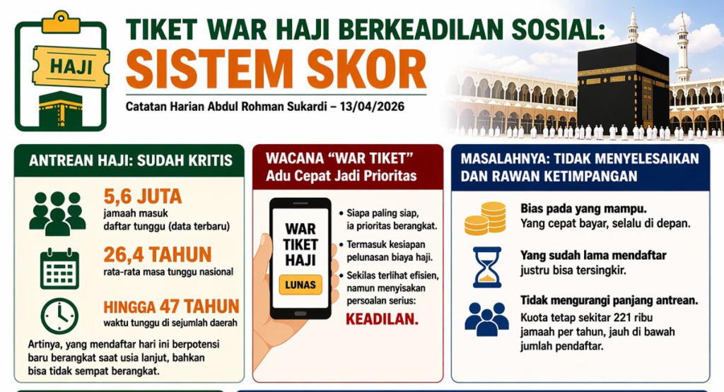 Pada akhirnya, persoalan haji tidak berhenti pada kuota, melainkan pada cara membaginya. “War tiket” menawarkan kecepatan, tetapi mengabaikan keadilan.